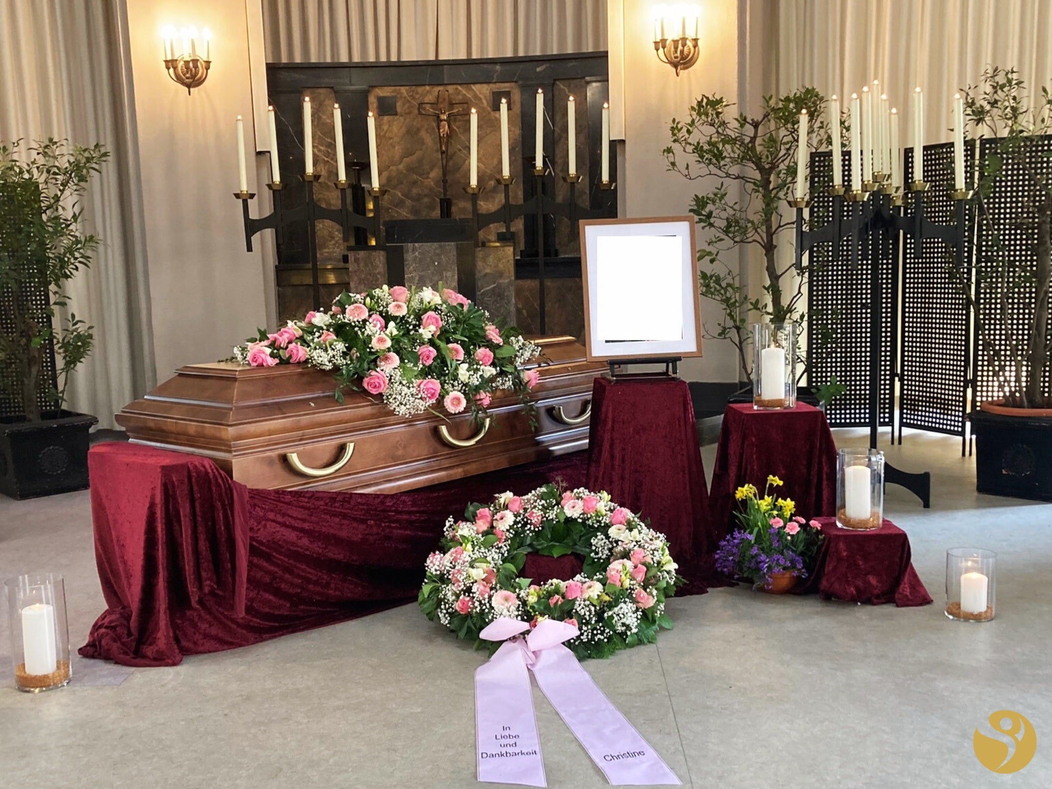 Blumendecke auf dem Sarg und ein Blumenkranz mit Schleifen.
