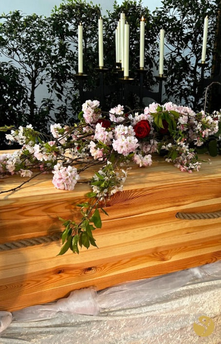 Akzentschmuck auf dem Sarg und gestecktes Herz mit Schleifen