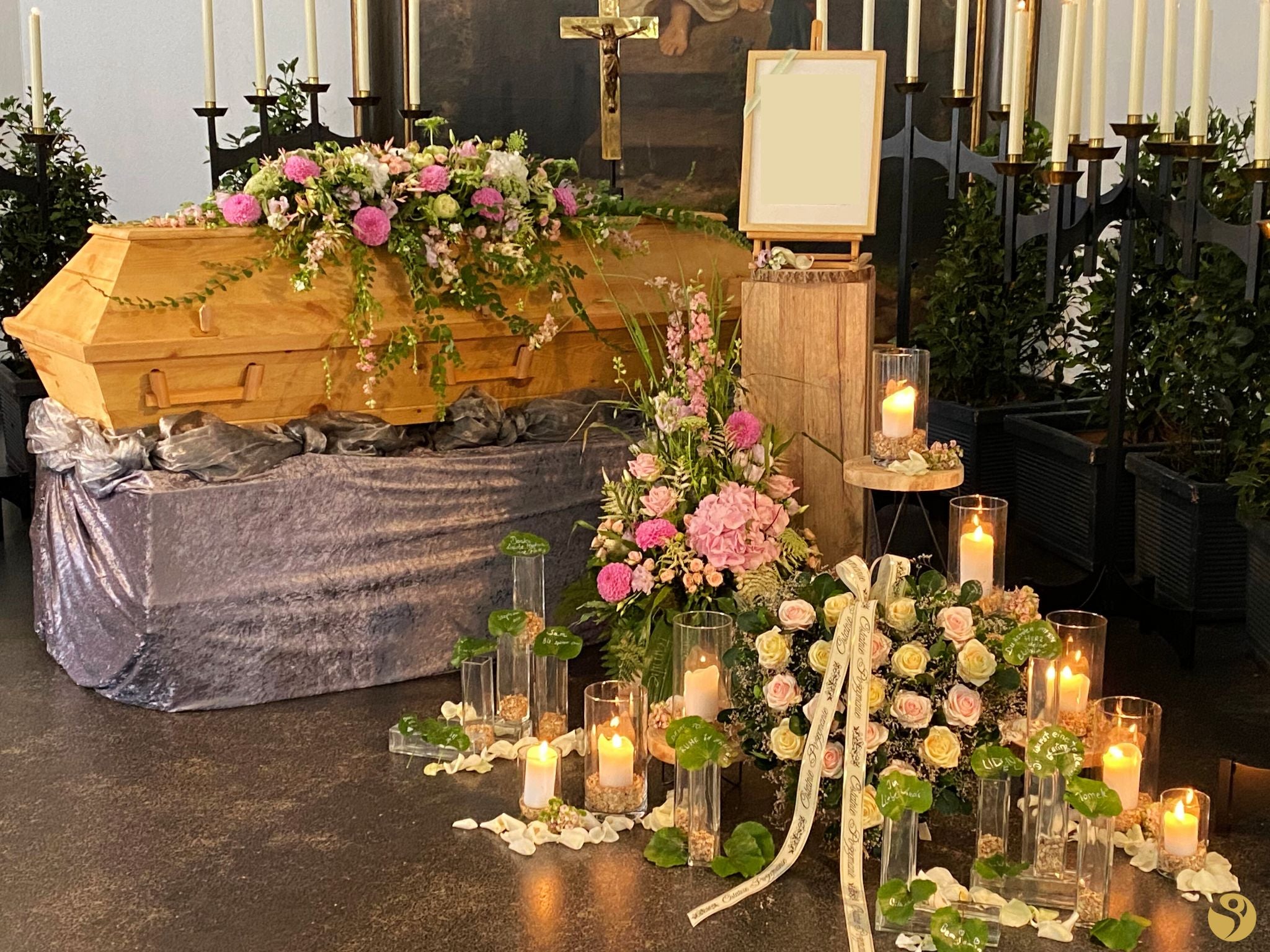 Blumenschmuck auf dem Sarg, Blumengesteck mit Schleifen, einzelne Blume für kleine Standvasen, Standvasen*, Altarkerzen in Gläser*, Holzscheiben*, Ständer* und Holzsäule*